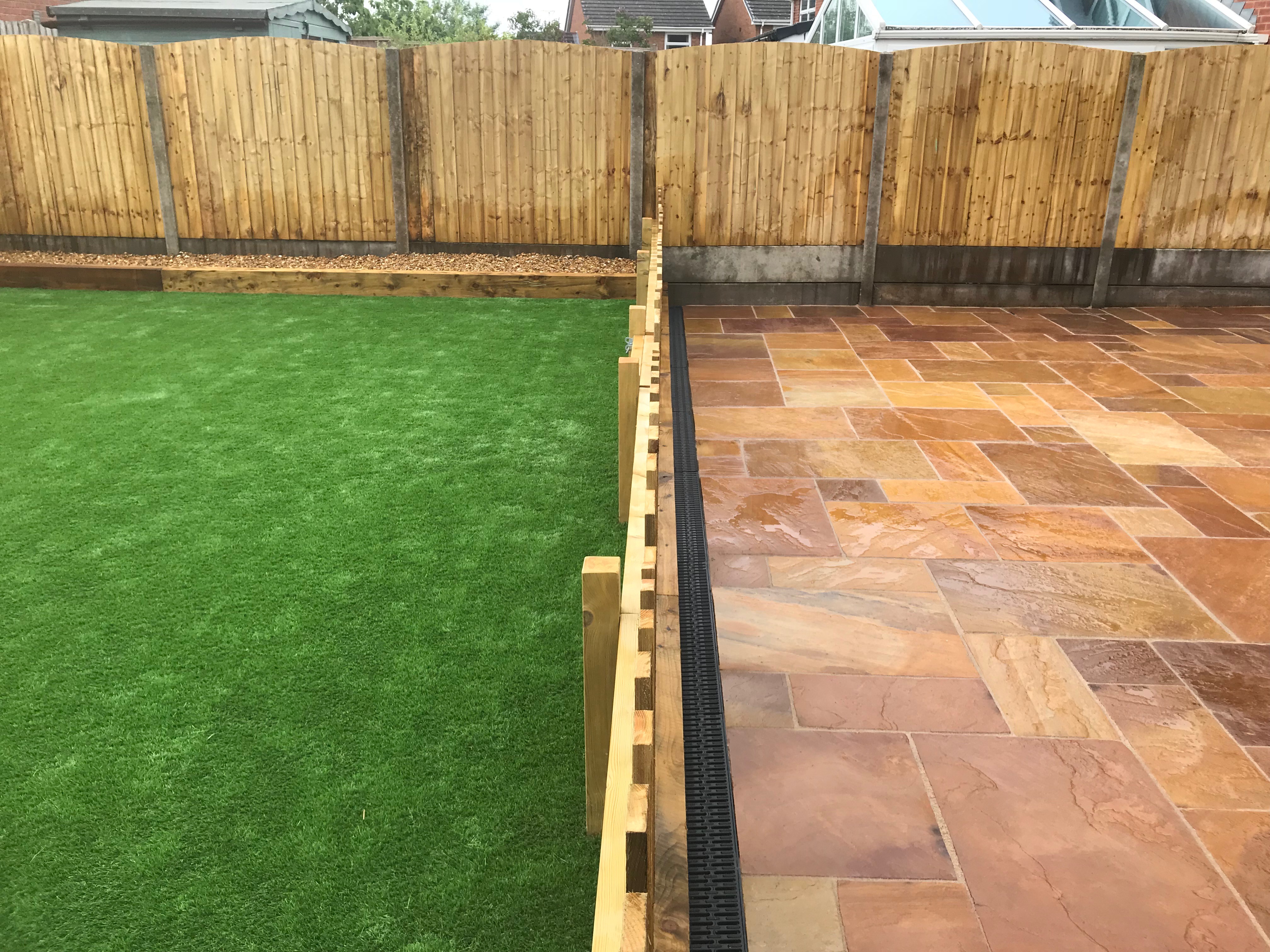 Golden brown natural stone with artificial lawn